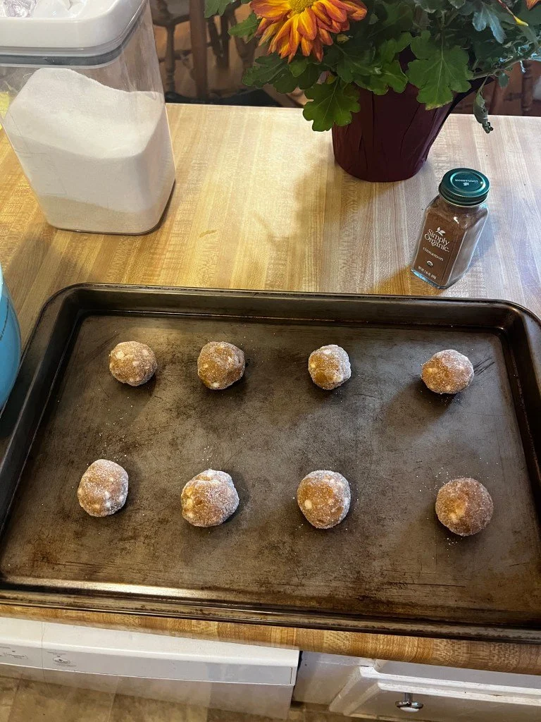 Scoop about 1.5 tablespoons of the dough and roll into a ball. Once formed, roll the dough in the sugar mixture.