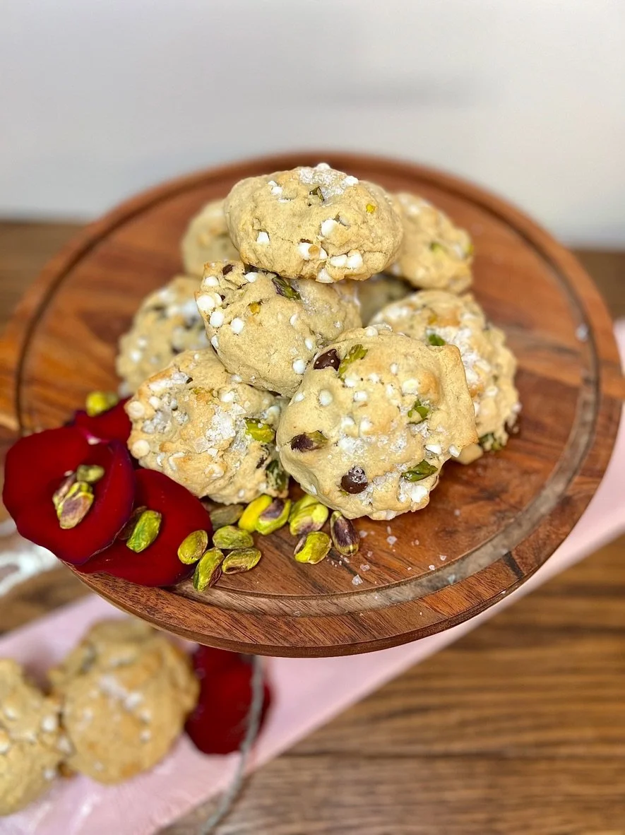 These cookies are a great crowd pleaser that are chewy, soft, and sweet. The nuts and rose water add in florals, spring/summer flavors. They are perfect for a tea party.